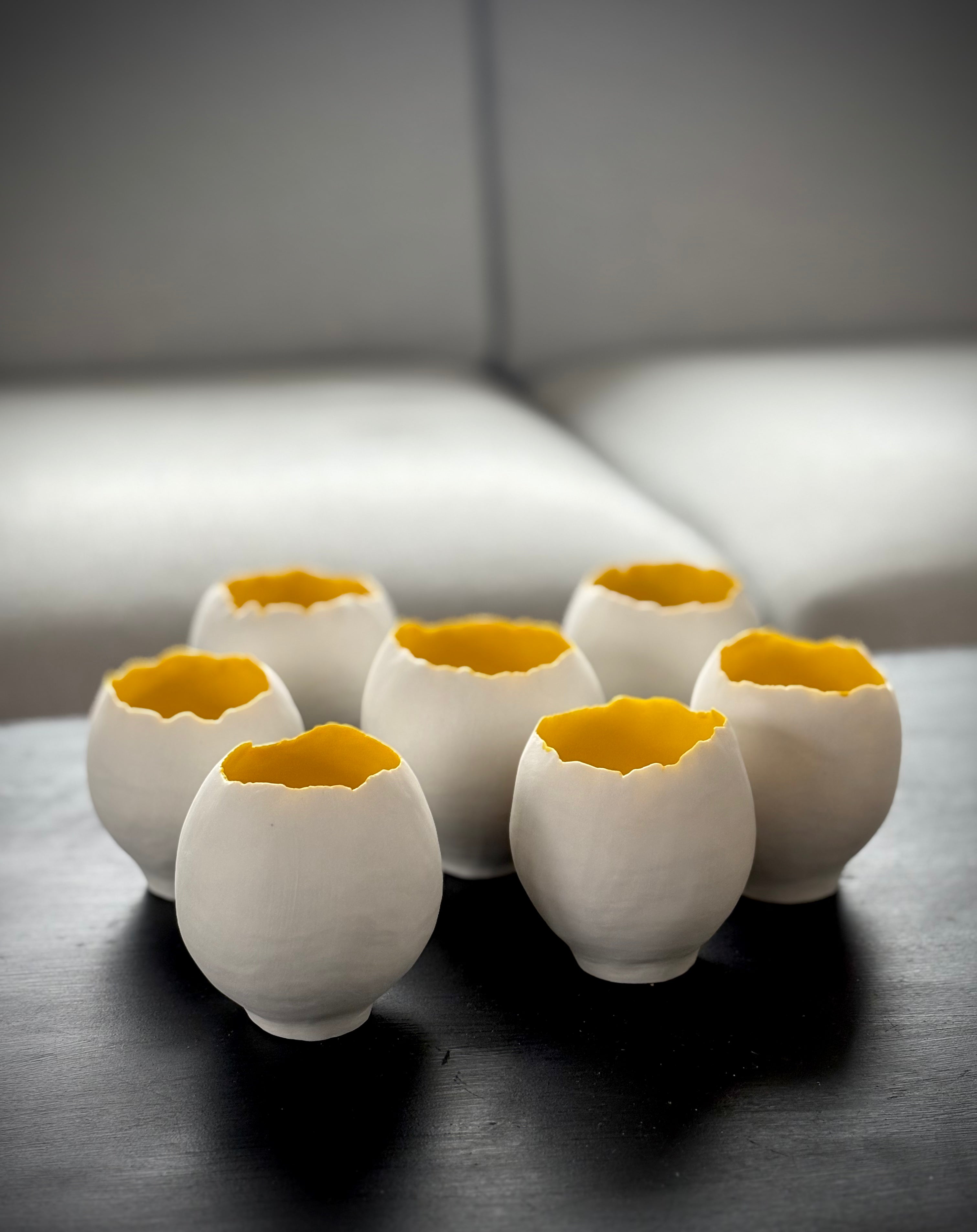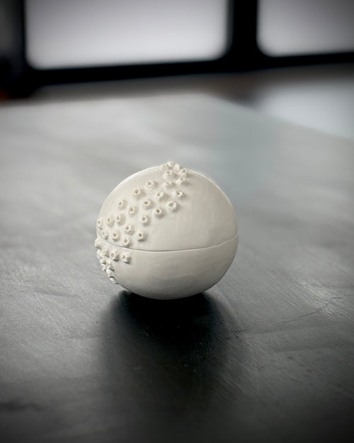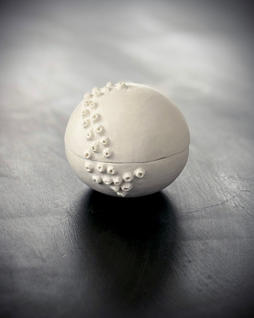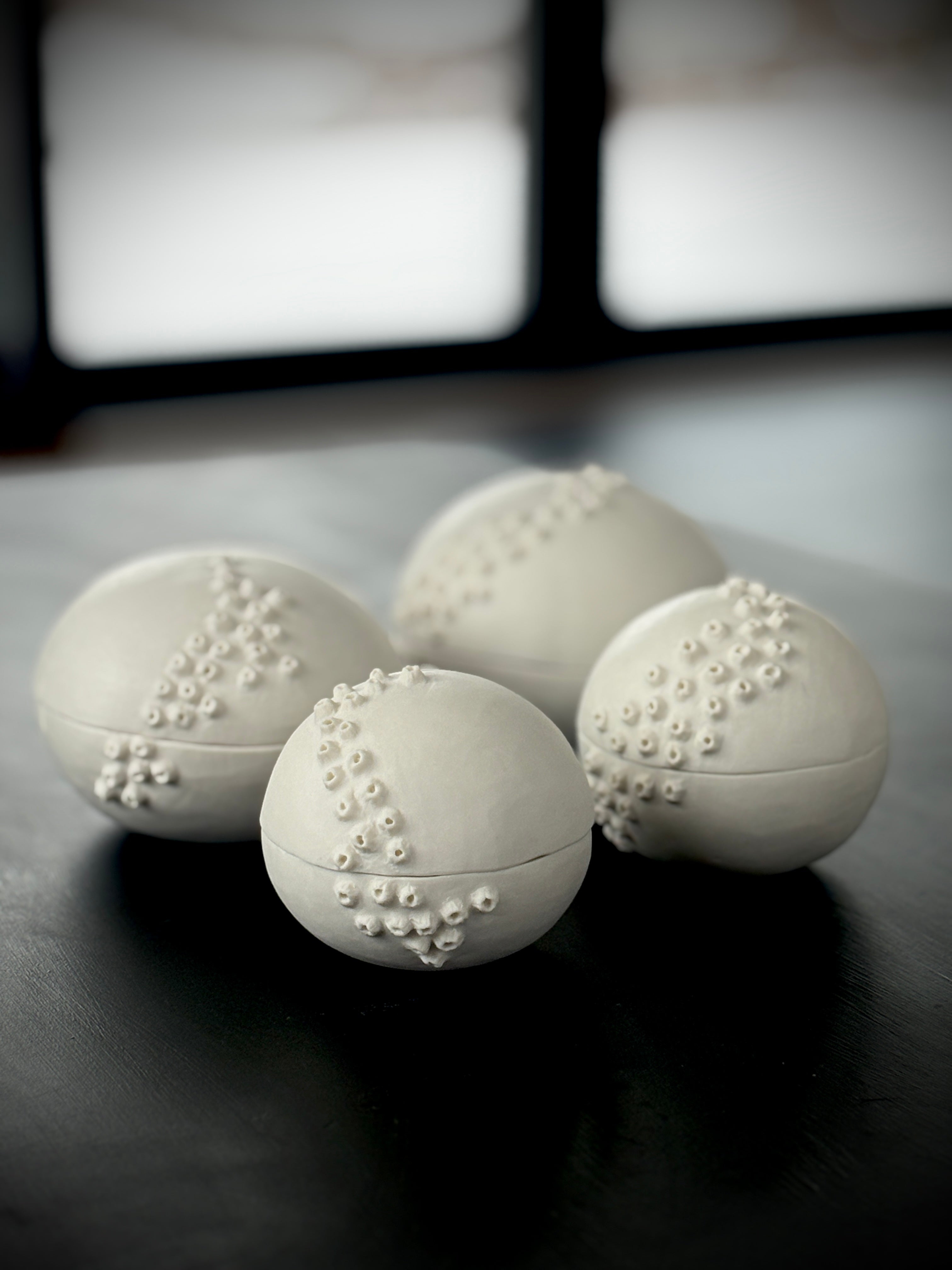 Askar i porslin dekorerad med små handgjorda havstulpaner. Jag har lämnat utsidan oglaserad för att skapa en känsla av att den skulle kunna ha formats av naturen själv.