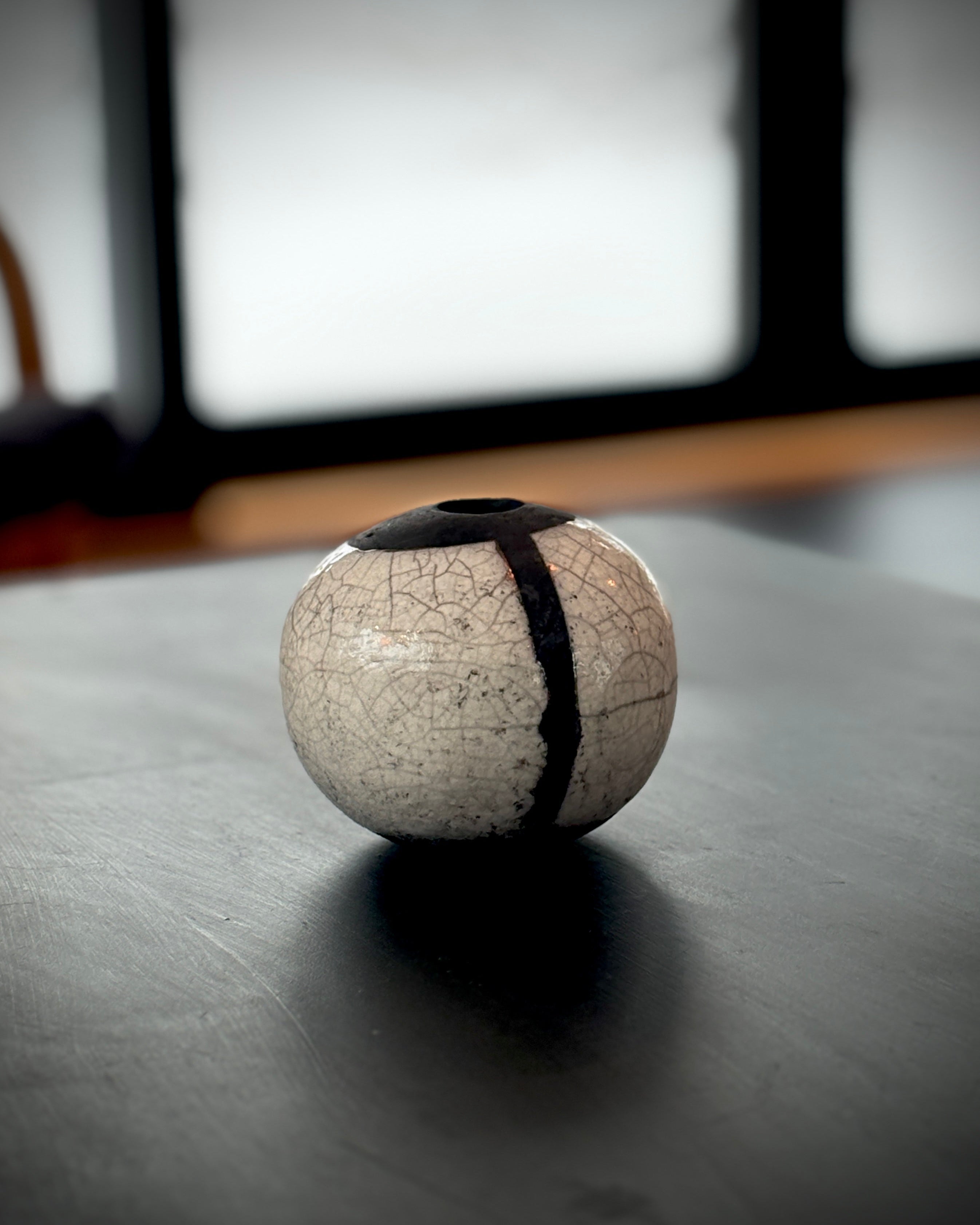 Raku är en japansk keramikteknik från 1500-talet, känd för sina krackelerade och ibland metalliskt skimrande ytor. Föremålen tas glödheta ur ugnen och kyls snabbt i vatten eller organiskt material, vilket skapar oförutsägbara mönster i mötet mellan eld, luft, vatten och lera.